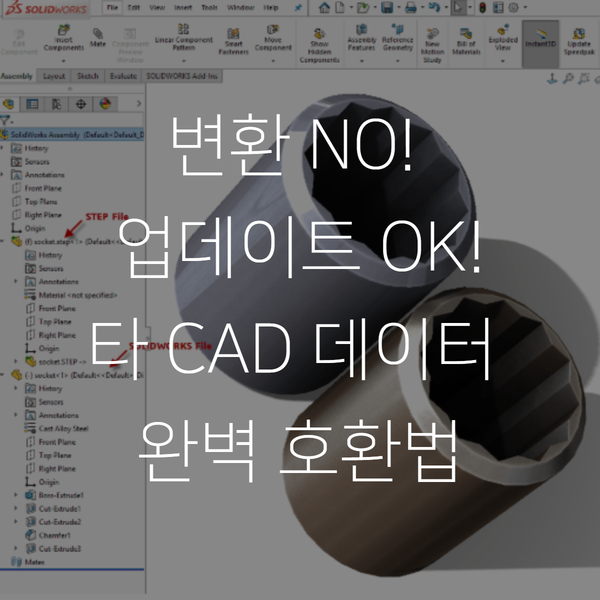 [SOLIDWORKS] 다른 CAD 데이터와의 완벽한 협업, 3D Interconnect란?설계 업무를 하다 보면 자사 소프트웨어 외에도 협력사나 고객사로부터 다양한 포맷의 CAD 데이터를 전달받게 됩니다. 이때 가장 큰 고민은 역시 '파일 변환'과 '데이터 업데이트'일 텐데요. 오늘은 솔리드웍스(SOLIDWORKS)의 혁신적인 기능, 3D Interconnect를 통해 이러한 고민을 어떻게 해결할 수 있는지 자세히 알아보겠습니다. 1. 3D Interconnect의 의미'Interconnect'라는 단어는 '~사이의 상호 연결'을 의미합니다. 솔리드웍스의 3D Interconnect는 이름 그대로 이종 CAD 데이터를 솔리드웍스로 통합하여 상호 연결하는 기능입니다.과거에는 타 CAD 데이터를 불러오기 위해 중간 포맷(STP, IGS 등)으로 변환하는 과정이 필수였지만, 이제는 그럴 필요가 없습니다. 2. 주요 특징: 변환 없이 바로 열기3D Interconnect의 가장 큰 장점은 별도의 변환 과정 없이 타 CAD 데이터를 솔리드웍스에서 바로 열 수 있다는 점입니다. 지원 포맷: CATIA, Creo, Inventor, NX, Solid Edge 등 주요 CAD 파일은 물론, STEP, IGES, JT와 같은 중립 포맷까지 폭넓게 지원합니다. 간편한 프로세스: '불러오기'나 '임포트' 메뉴를 복잡하게 거치지 않고, 솔리드웍스의 '열기' 대화상자에서 해당 파일을 선택하기만 하면 즉시 모델링을 확인할 수 있습니다. 인벤터와 솔리드웍스 사용자 만족도 점수로 본 진짜 차이▶ 3. 지능적인 데이터 연결 (Link)3D Interconnect로 불러온 데이터는 단순한 형상 복사본이 아닙니다. 솔리드웍스 데이터와 원본 데이터 사이에 지능적인 링크(Link) 관계가 형성됩니다. 아이콘 확인: 피처 매니저 디자인 트리에서 녹색 화살표가 포함된 아이콘을 통해 3D Interconnect로 연결된 상태임을 알 수 있습니다. 자동 업데이트: 만약 원본 데이터(예: Inventor 파일)가 수정되면, 솔리드웍스가 이를 자동으로 감지합니다. 모델 업데이트: 아이콘에 업데이트 표시가 뜨면, 마우스 우클릭 후 '모델 업데이트'만 클릭하세요. 변환 과정을 다시 거칠 필요 없이 수정된 내용이 즉시 반영됩니다. 4. 유연한 작업 환경 제공모든 작업에서 링크가 필요한 것은 아니죠? 3D Interconnect는 사용자의 필요에 따라 유연하게 설정할 수 있습니다. 연결 끊기: 특정 시점부터 원본과의 링크를 제거하고 솔리드웍스 독립 파일로 작업하고 싶다면 '연결 끊기' 기능을 사용하면 됩니다. 옵션 설정: 시스템 옵션에서 3D Interconnect 기능을 끄고 기존 방식처럼 데이터를 불러올 수도 있어, 작업 상황에 맞는 최적의 선택이 가능합니다. 5. 요약: 왜 3D Interconnect인가? 시간 절약: 번거로운 데이터 변환 및 재작업 시간이 대폭 단축됩니다. 데이터 무결성: 변환 과정에서 발생할 수 있는 데이터 손실 걱정 없이 원본의 의도를 그대로 유지합니다. 원활한 협업: 서로 다른 CAD를 사용하는 팀이나 업체와도 데이터 장벽 없이 자유롭게 소통할 수 있습니다. 이제 더 이상 파일 확장자 때문에 고민하지 마세요. 솔리드웍스 3D Interconnect와 함께라면 어떤 설계 데이터도 여러분의 강력한 자산이 됩니다! 솔리드웍스 하위버전에서 상위버전 파일열기▶