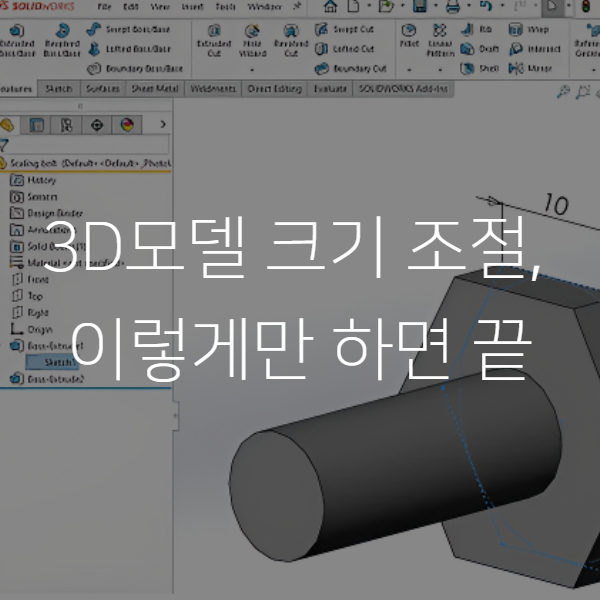 ✅ 솔리드웍스 모델 스케일(Scale) 조절 기능 1) 스케일 기능 소개솔리드웍스에는 모델 전체 또는 특정 바디의 크기를 비율로 확대하거나 축소할 수 있는 Scale(스케일) 기능이 제공됩니다.이 기능은 3D프린팅 출력 크기 조절, 금형 수축률 보정, 외부 모델의 크기 보정 등에 자주 사용됩니다. 2) 스케일 기능 실행 방법Insert → Features → Scale메뉴로 진입하면 스케일 속성을 설정하는 창이 열립니다. 3) 스케일 옵션 설명▶ Scale about (기준점 선택) Centroid (무게중심 기준): 모델 중심을 기준으로 균일하게 확대/축소 Coordinate System (좌표계 기준): 특정 좌표계를 기준으로 스케일 Origin (원점 기준): 원점에서 모델을 확대/축소 Sketch Point / Vertex 선택 가능: 특정 점 중심으로도 스케일 가능 4) Uniform Scaling (균일 스케일) 모든 방향(X/Y/Z)이 동일 비율로 확대됨 2 → 2배 확대 0.5 → 절반으로 축소 예:0.7 입력 → 전체 크기가 70%로 줄어듦1.2 입력 → 전체 크기가 120%로 커짐 5) Non-Uniform Scaling (비균일 스케일)Uniform 체크 해제 시: X, Y, Z 방향 각각 다른 비율 입력 가능예: X=1, Y=2, Z=0.5 특정 방향으로만 늘리거나 줄이는 경우 유용(예: 제품을 특정 길이만 늘려야 할 때) 비균일 스케일은 기계 가공/도면 치수의 왜곡이 생길 수 있어실제 설계에는 잘 사용하지 않음 주로 형상 보정 용도로 활용 6) Solid Body 선택 Entire Part (전체 파트 스케일) 또는 특정 바디만 선택하여 스케일 예를 들어 멀티바디 파트에서‘하나의 바디만 축소/확대하고 싶을 때’ 유용함. 7) 스케일 피처가 재생산성(MBD)에 미치는 영향 피처 트리에 Scale1 등으로 생성됨 이후 모델링 작업에도 안정적으로 반영됨 스케일은 기하 자체를 조절하지만 스케일된 이후 도면에서 다시 치수를 표시하면실제 크기로 출력 8) 활용 예시 ▶ 3D 프린팅 시 2% 정도 크게 만들어 수축률 보정예: 1.02 입력▶ 다른 소스(스캔 모델 등)에서 가져온 STL 크기 보정예: 0.5 입력으로 절반 축소▶ 금형(Mold) 수축률 적용각 수지별 수축률 세팅 가능 ✅ 한 줄 요약솔리드웍스의 스케일 기능은 모델의 크기를 균일 또는 비균일하게 조절하며, 기준점·바디 선택·비율 등 세부 설정을 통해 금형/3D프린팅/스캔 데이터 보정 등 다양한 실무 상황에서 사용되는 핵심 기능이다. 가변 피치를 이용한 나선형곡선▶