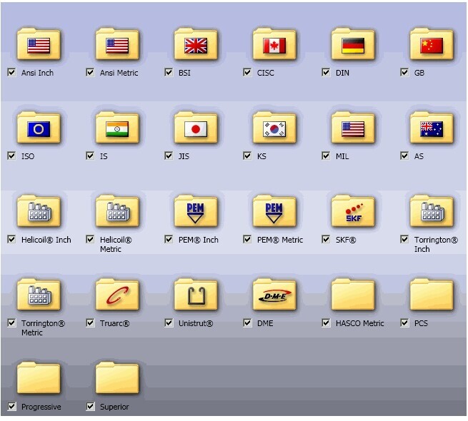 SOLIDWORKS TOOL BOX는 ISO, DIN, BSI 및 ANSI와 같은 모든 주요 표준을 지원합니다.