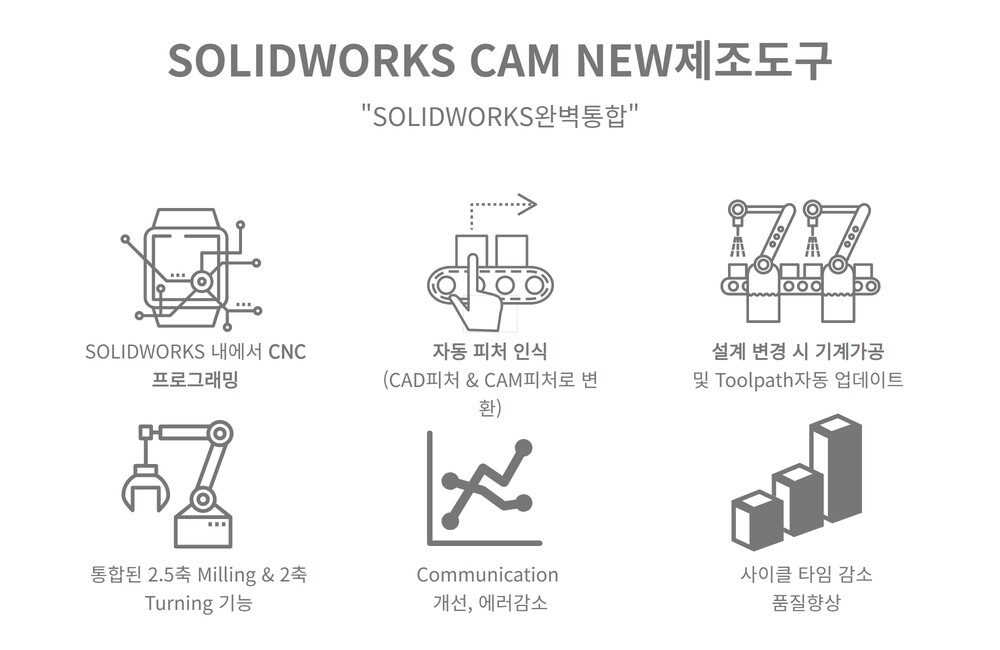 SOLIDWORKS CAM(CAMWorks 기반)은 완전히 통합된 지식 기반 기술로 2.5축 CNC밀링 및 CNC선반을 위한 솔루션입니다. 단일 시스템에서 설계 및 제조 공정을 통합하여 제품개발 및 가공에 편리한 최적의 환경을 제공합니다.제품 개발 프로세스 초기에 설계에 대한 가공상의 이상 유무를 평가함으로써 예기치 않은 비용 지출과 양산 지연에 대한 문제가 발생하는 것을 방지할 수 있습니다.